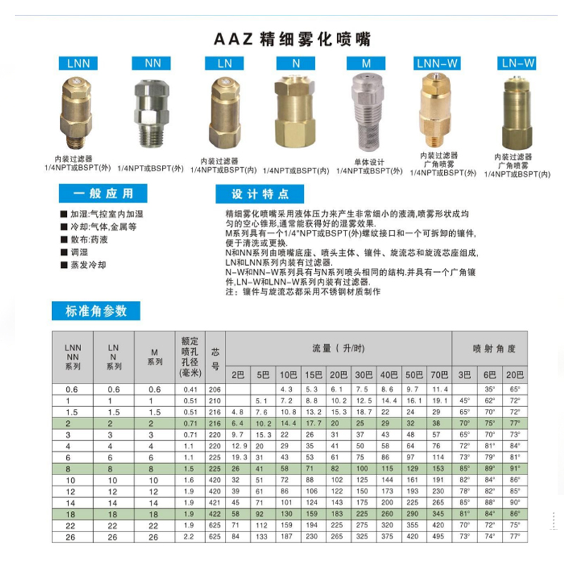 N-W和NN-W系列具有與N系列噴頭相同的結(jié)構(gòu),并具有一個(gè)廣角鑲件,LN-W和LNN-W系列內(nèi)裝有過濾器