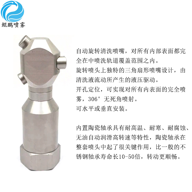 自動(dòng)旋轉(zhuǎn)清洗噴嘴,對(duì)所有內(nèi)部表面都完 全在中噴洗軌道覆蓋范圍之內(nèi)。 旋轉(zhuǎn)噴頭上獨(dú)特的三角扇形噴嘴設(shè)計(jì),由 清洗液流動(dòng)所產(chǎn)生的液壓驅(qū)動(dòng)。 開(kāi)孔定位,可實(shí)現(xiàn)對(duì)所有內(nèi)表面的完全噴 霧,306無(wú)死角噴射。 可水平或垂直安裝。 內(nèi)置陶瓷軸承具有耐高溫、耐寒、