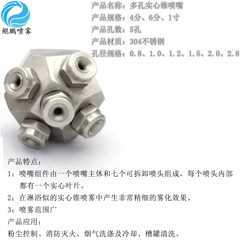 產(chǎn)品特點(diǎn): 1:噴嘴組件由一個(gè)噴嘴主體和七個(gè)可拆卸噴頭組成,每個(gè)噴頭內(nèi)部 都有一個(gè)實(shí)心葉片。 2:在淋浴似的實(shí)心錐噴霧中產(chǎn)生非常精細(xì)的霧化效果。 3:噴霧范圍廣 產(chǎn)品應(yīng)用: 粉塵控制、消防滅火、煙氣洗滌及冷卻、槽罐清洗。