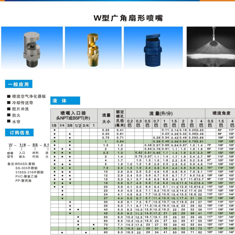 W型廣角噴嘴特點1、廣角噴嘴能產生中等沖擊力的廣角扇形噴霧形狀,噴出的液霧分布均勻,液滴大小中等2:圓形噴孔、大而通暢的流道把阻塞現(xiàn)象減少到最低程度。