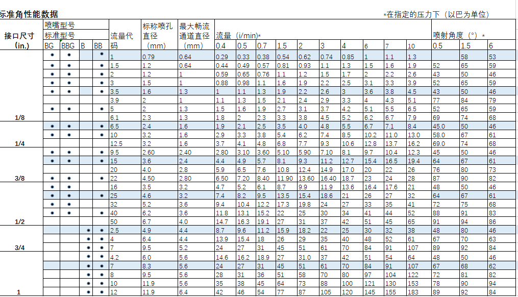 使用時(shí)產(chǎn)生實(shí)心錐形噴霧形狀,噴霧區(qū)域成圓形,噴霧角度為43-120度。 2、能在大范圍流量和壓力下產(chǎn)生分布均勻、液滴大小為中等到偏大的噴霧,葉片設(shè)計(jì)是其設(shè)計(jì)機(jī)理,并大而暢通的通道和先進(jìn)的噴流控制。 3、該噴嘴對(duì)于要求完全覆蓋一個(gè)區(qū)域的噴流應(yīng)用領(lǐng)域能發(fā)揮較好的效果。 4、 BB系列金屬噴嘴為外螺紋接頭,B系列金屬噴嘴為內(nèi)螺紋接頭